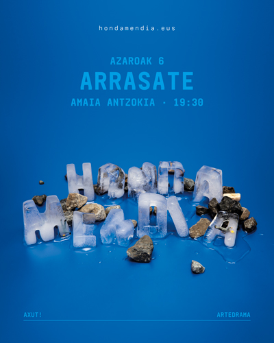 • HondamendiaAxut! Kolektiboa 'Hondamendia' antzezlanak,Harkaitz Canoren testuan oinarritua, pandemia eta Zaldibarko zabortegiko dramaditu ardatz. Hitz hoberik ezean “katastrofe”deitu diogunak egoera larri eta estuan jarri gaitu, eta pentsatzen dugugertaera tamalgarri haien ondoren ezin zaigula ezer okerragorik gertatu.Pantailek hitzak ordezkatu dituzte eta zaborra gure nortasun-ikur bihurtu da.Zabor mendi erraldoian bilaibilita, galdera ikurrak baino ez ditugu aurkitu, obra honetan bideabalizatzeko erabiltzen ditugunak. Halaber, pentsarazi digu bizitza den bezalamaitatu behar dela, baldintzarik gabe, bere misiotik eta zentzutik harago.2022ko azaroaren 6an, igandea (Amaia antzokia) 19:30etan
