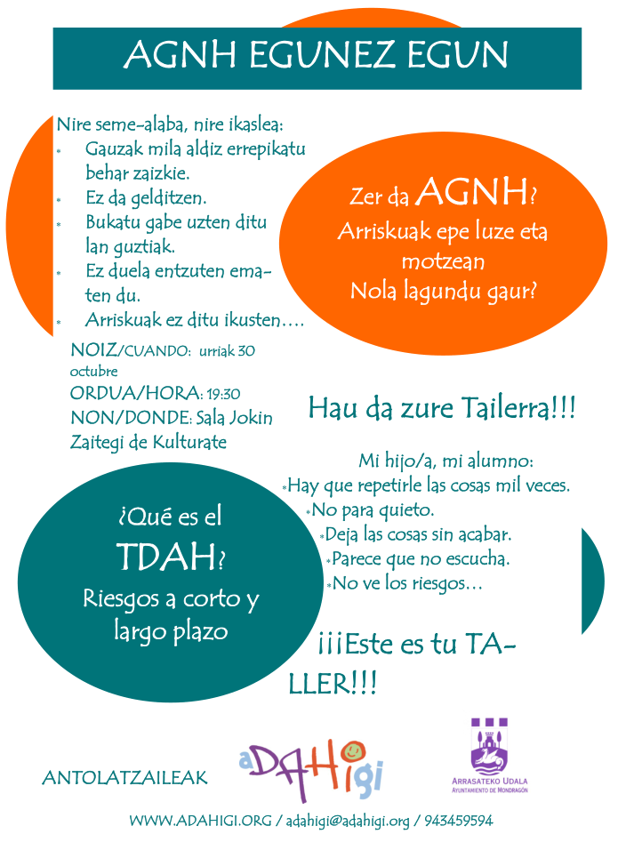El 27 de Octubre se celebra el día del TDHA y  La Asociación de Déficit de Atención con Hiperactividad de Guipúzcoa (ADAHIGI) ha organizado  la siguiente charla: