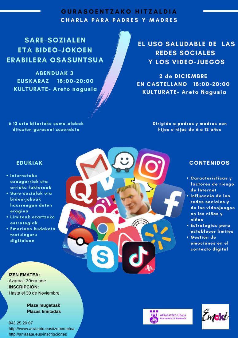 - Charla para padres y madres: “Sare-sozialen eta bideo-jokoen erabilera osasuntsua”, en euskera, en el salón de actos de Kulturate