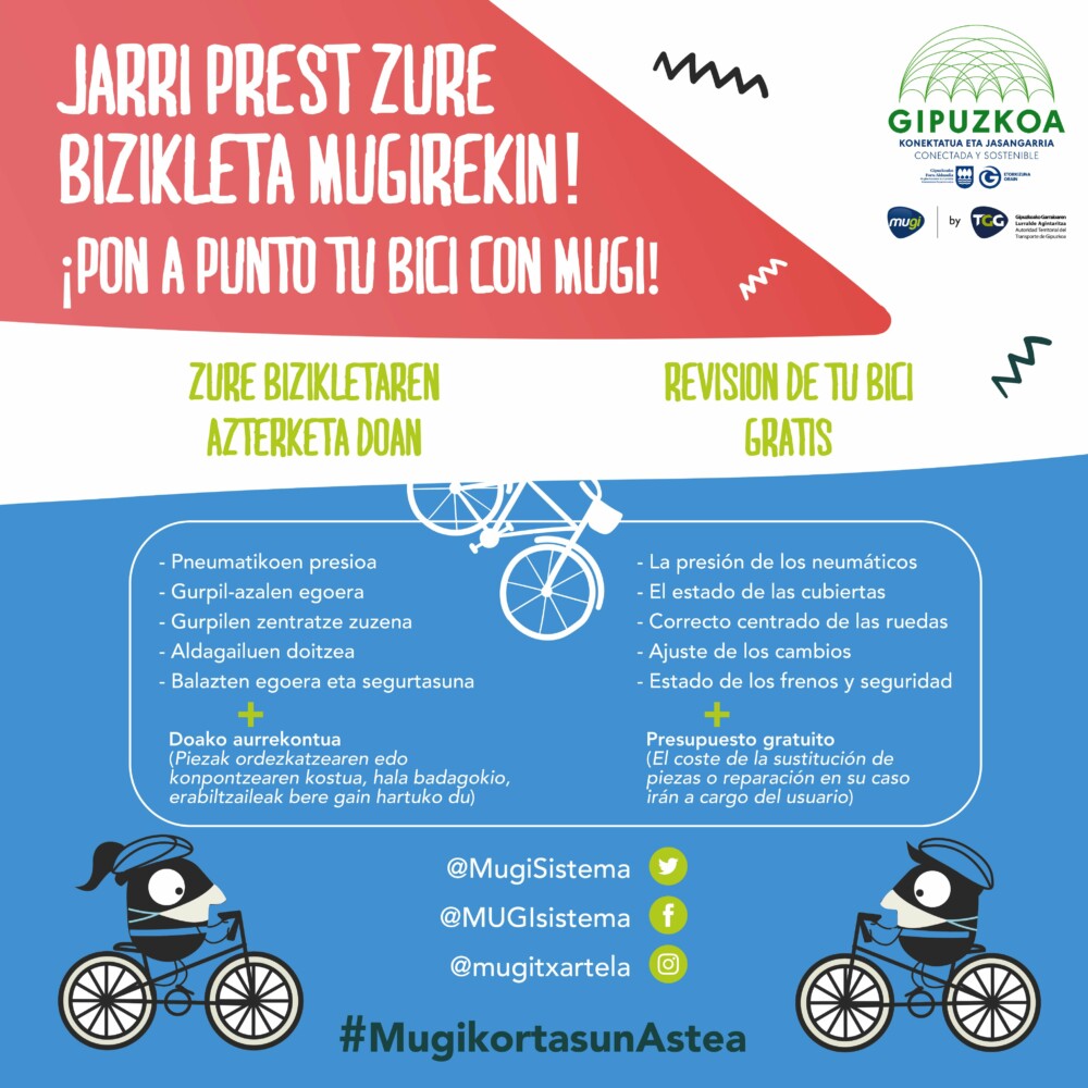 • MUGI txartel pertsonalizatua eta bizikleta eramaten dituzten guztiek bizikleta berrikusteko eta doitzeko doako zerbitzua baliatu ahal izango dute. Gipuzkoako Foru Aldundiaren eskutik. Zozketak egingo dira MUGIrekin.