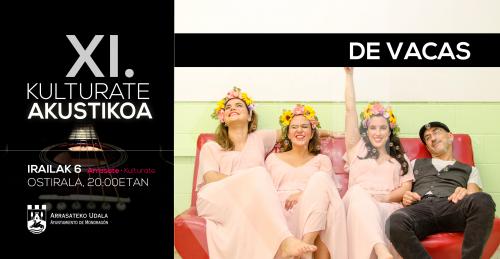 - Son cuatro vacas. Cuatro vacas que ríen y cantan. Presentan un espectáculo fresco como el agua de los arroyos. Disfrutan encima del escenario para que vosotros disfrutéis. Mezcla de voces y guitarra, armonías que estimulan los sentidos. Cantan en todos los idiomas del mundo, pero aman a nuestros poetas por encima de todo, como Enrique Iglesias. Rescatan estribillos olvidados, tarareos que han sido populares en las voces de Cristina da Aguieira o Mónica da Laranxeira. Info gehiago eta abestiak: http://devacas.gal/
