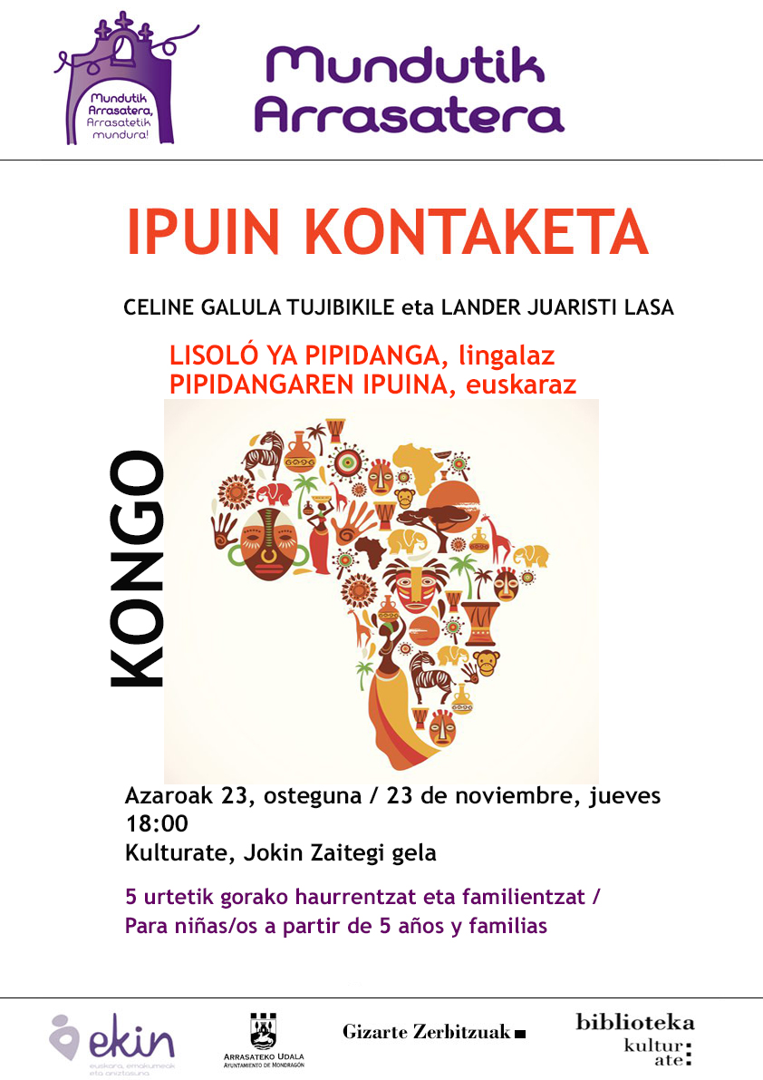 - Kongoko ipuinak kontatuko dituzte Celine Galula Tujibikilek eta Lander Juaristi Lasak, lingalaz eta euskaraz. 5 urtetik gorako haur eta familiei zuzendutako saioa da.