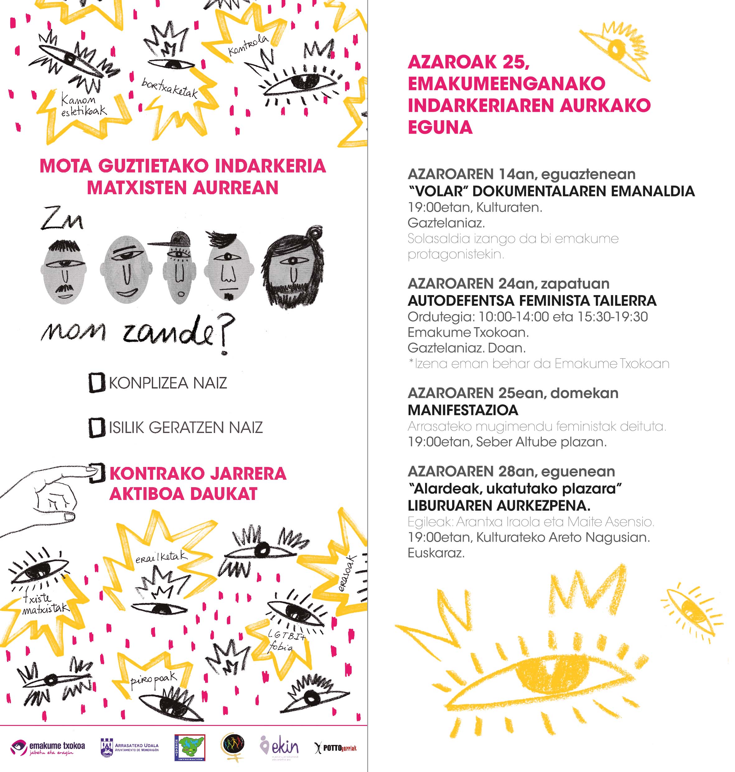 Aurtengo leloarekin azpimarratu dugu indarkeria matxista guztiei aurre egin beharra eta, bereziki, sustatu gura izan dugu gizonezkoek jarrera aktiboa hartu dezaten indarkeria matxistaren aurka.